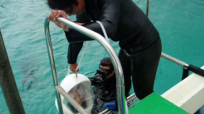 マリンウォーク用のヘルメットは、海の中をヘルメットをかぶり水中で歩きながら呼吸する道具です。