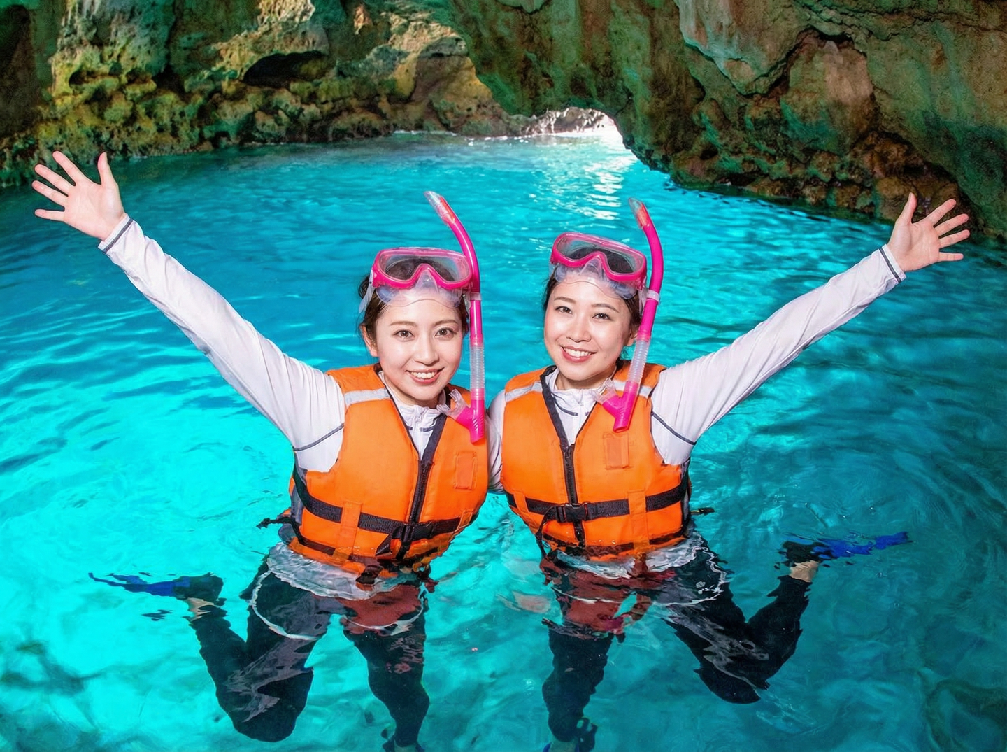 シュノーケリングは、水中メガネ、シュノーケル(水中に顔をつけたまま呼吸をするための用具)フィン(足ひれ)を装着して、ライフジャケット、ウェットスーツを着用して、海中をのぞき込みながらプカプカと水面をご案内しながら、熱帯魚や青の洞窟の景色を楽しむマリンスポーツです。