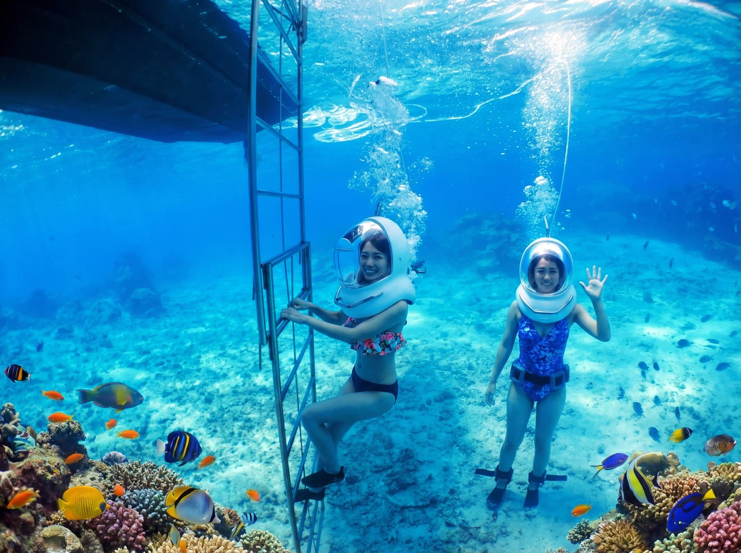・ヘルメットをかぶって、水底を散歩しながらダイビングを楽しめます