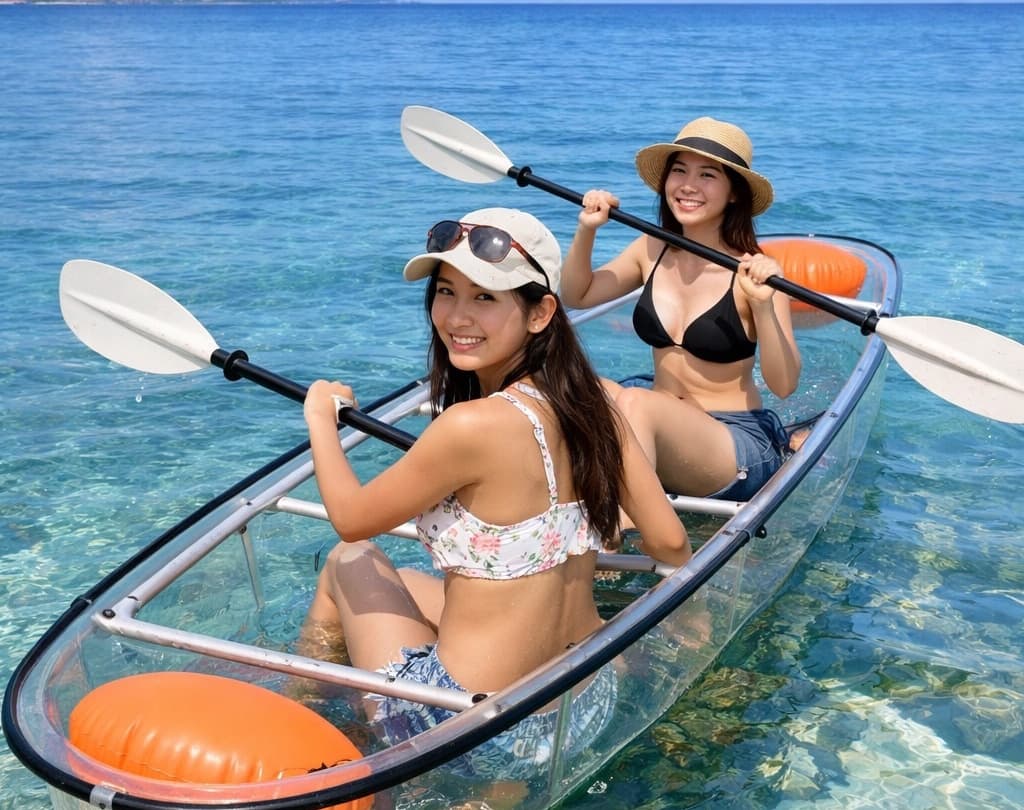 初めての方でも楽しめるよう、パドルも透明な特別なスケルトンカヤックでご案内します。社員旅行や、卒業旅行、団体旅行、修学旅行など大人数でのご案内もしておりますのでお気軽に申し込み、お問い合わせください。
